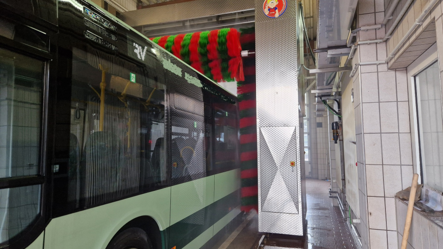 In Sachsen wurde eine Buswaschanlage erneuert. Sie ist mit einem Automatik-Start ausgerüstet, sodass der Fahrer nicht aussteigen muss. Optische Anweisungen gibt eine zusätzliche